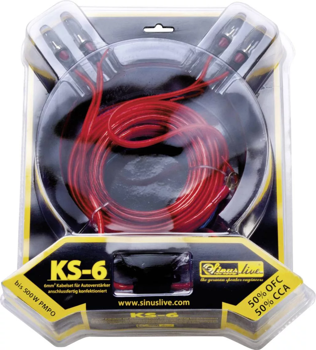5m akku kábel, 6mm², piros, fonott köpennyel, 30A biztosító, tartóval, 0,8m akku kábel, 6mm2, kék, az erősítő testjéhez, valamint 0,5m kék, külön akku testnek. Mindehhez 5m CK RCA kábel háromszoros, réz, mágneses litze és alufólia árnyékolással. Rövid, aranyozott dugókkal a kompakt rádió csatlakozáshoz, meghosszabbított vezérlő vezetékkel. Kompletten, aranyozott kábelsarukkal, csatlakozáshoz készre szerelve.