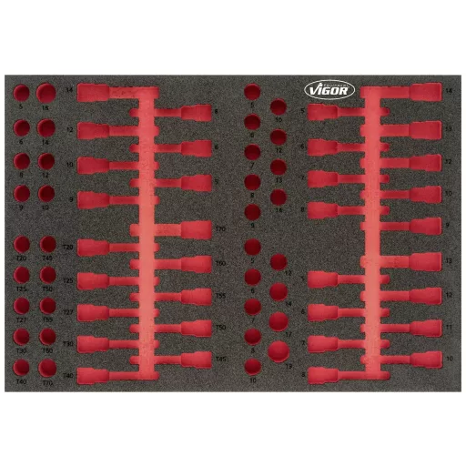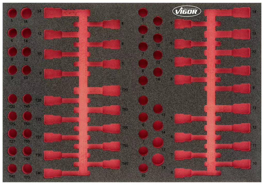 Puha habbetét, üres VIGOR 2 komponensű puha habszivacs betétek Könnyen tisztítható: folyó víz alatt tisztítsa és szárítsa A piros mélyedésen keresztül azonnal észrevehető a hiányzó szerszámok Minden a helyén - tökéletes rend Védi a szerszámokat, mivel egy nem- csúszási mód Minden szerszámnak megvan a maga előre meghatározott helye. Ellenáll az olajoknak és zsíroknak