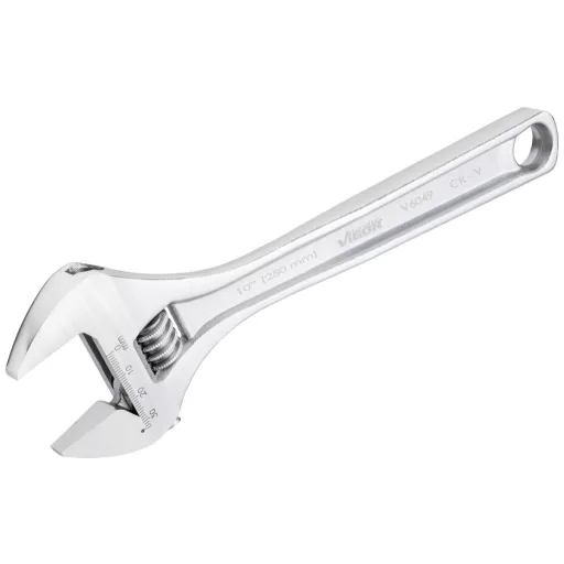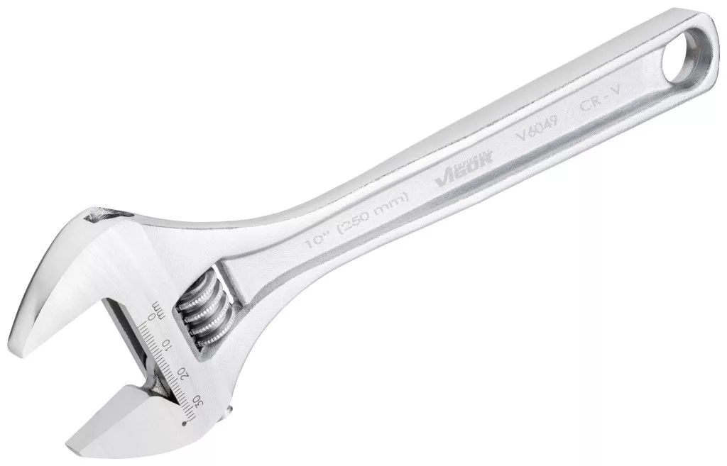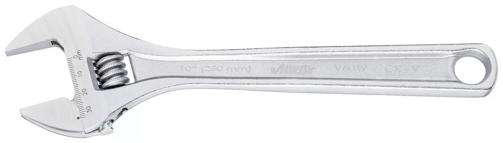 A csavarkulcs méretének egykezes állítása a kulcsfejen lévő állítókerékkel Pofa helyzete 15°-os szögben Jól olvasható mm-es skála a kulcsfejen Vékony, stabil fogantyú Függesztő furat Méretek / hossz: 250 mm