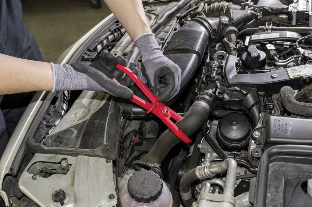 Rugalmas tömlővezetékek leszorítása Biztonságos, állítható reteszelés Karbantartási munkák benzinnel, fagyállóval, olajjal stb. Hőállóság 220°C-ig
