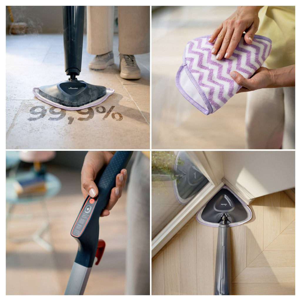 A STEAM PLUS PRO elpusztítja a baktériumok és vírusok 99,9%-át*, és különösen gyengéd az érzékeny padlókon is. A mindössze 15 másodperces gyors felmelegedési időnek köszönhetően értékes időt takaríthat meg tisztítás közben. A markolaton található könnyen használható kezelőszerv lehetővé teszi az optimális gőzbeállítás kiválasztását a különböző padlótípusokhoz, például csempékhez, szőnyegekhez, lezárt vagy érzékeny padlókhoz. Háromszög alakú kialakításának köszönhetően könnyen eléri a sarkokat és a szűk helyeket. Érzékeny padlókhoz a STEAM PLUS PRO speciális beállítást kínál alacsony gőzkibocsátással, valamint érzékeny felületű fedéllel, amely alapos és gyengéd tisztítási eredményt biztosít. Az integrált vízkőtelenítési jelző megkönnyíti a készülék karbantartását, míg a praktikus tárolószőnyeg kényelmes tárolást tesz lehetővé és védi a padlót. Az ablaktörlő huzatok mosógépben moshatók akár 60°C-on.