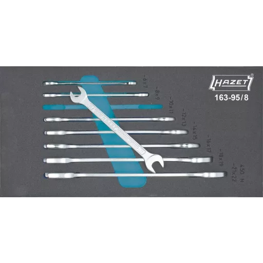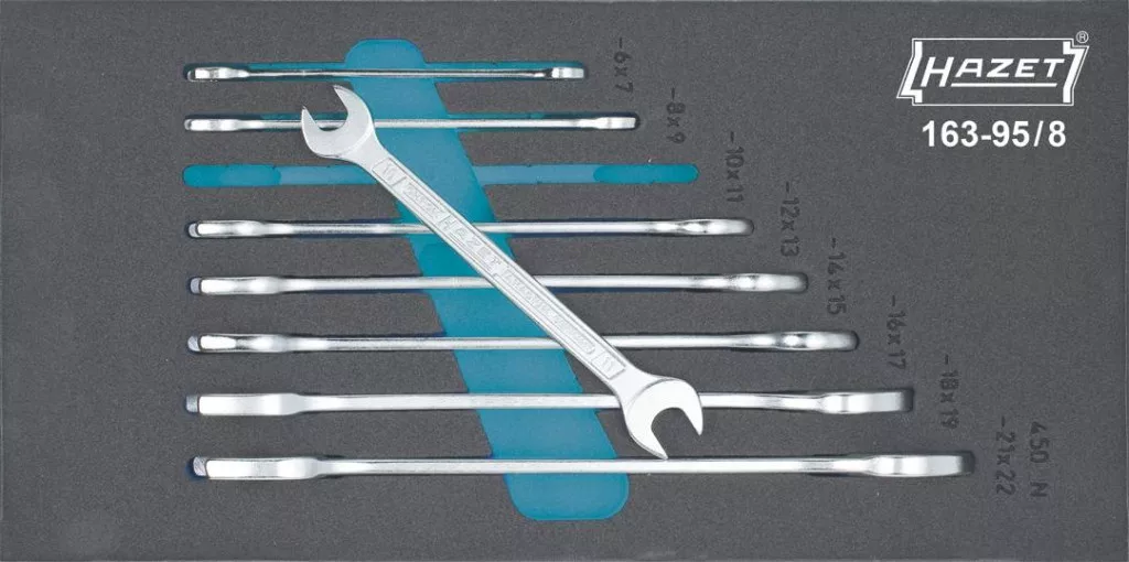 8 részes kettős villáskulcs készlet (SmartCase L 1/3) · Safety-Insert-System - Az összes szerszám rázkódásmentesen beágyazva - Ha hiányzik egy szerszám, az rögtön feltűnik · A betétek tisztíthatók (Folyó víz alatt kefével letisztítani és már kész is!). · Illik minden HAZET Assistent fiókos szerszámos kocsiba — — Az Assistent 173, 179 és 180 szerszámkocsik esetében kiegészítés céljából ajánljuk még a 173-36/5 műanyag betétet vagy a 163-522x40 ill. 163-522x50 habszivacs betéteket