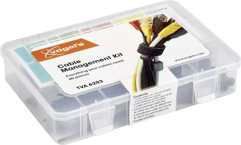 A Vogel's TVA 6203 készlete 40 elemet tartalmaz: 12 db kábelkötegelőt (6 db 120 mm hosszú és 6 db 180 mm hosszú) 6 db öntapadó kábeltartó (3 db 1 kábelhez és 3 db 3 kábelhez) 8 db tépőzár (4 db 120 x 5 mm-es és 4 db 300 x 20 mm-es) 6 db öntapadó kábelkötegelő rögzítőblokk (3 db 19 x 19 mm-es és 3 db 23 x 23 mm-es) 8 különböző színű kábeljelölés.