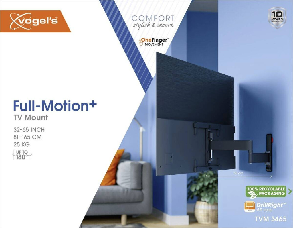 A Vogel's COMFORT full-motion TV fali tartójával még jobban élvezheti gyönyörű OLED TV-jét. A fali tartót kifejezetten az OLED TV-k biztonságos és elegáns falra rögzítéséhez fejlesztették ki. 180°-ig elforgatható, így a szoba bármely pontjáról élvezheti OLED TV-jét. Ez az itt bemutatott változat 32-65 hüvelykes, legfeljebb 25 kg tömegű televíziókhoz alkalmas. A One-Finger ™ Movement technológiának köszönhetően egyetlen ujjal is finoman a kívánt pozícióba fordíthatja TV-jét. A TiltAnchor™ rendszerrel pedig egyszerűen rögzítheti a TV-t biztonságosan a helyére. A Vogel's COMFORT Full-Motion + TV fali tartójának felszerelése is nagyon egyszerű. Fúrósablon, csavarok, Fischer® DuoPower tiplik, vízmérték és kábelkötegelők a szállítási terjedelem részét képezik. Az ingyenes Vogel's DrillRight™ AR alkalmazással az első fúrás megjelölése sem nehéz. A Vogel's COMFORT Full-Motion + TV fali tartóját a biztonság jellemzi. TÜV-tanúsítvánnyal rendelkezik, és a maximális terhelhetőség háromszorosával tesztelték. Minden COMFORT TV fali tartóra 10 év garanciát vállalunk.