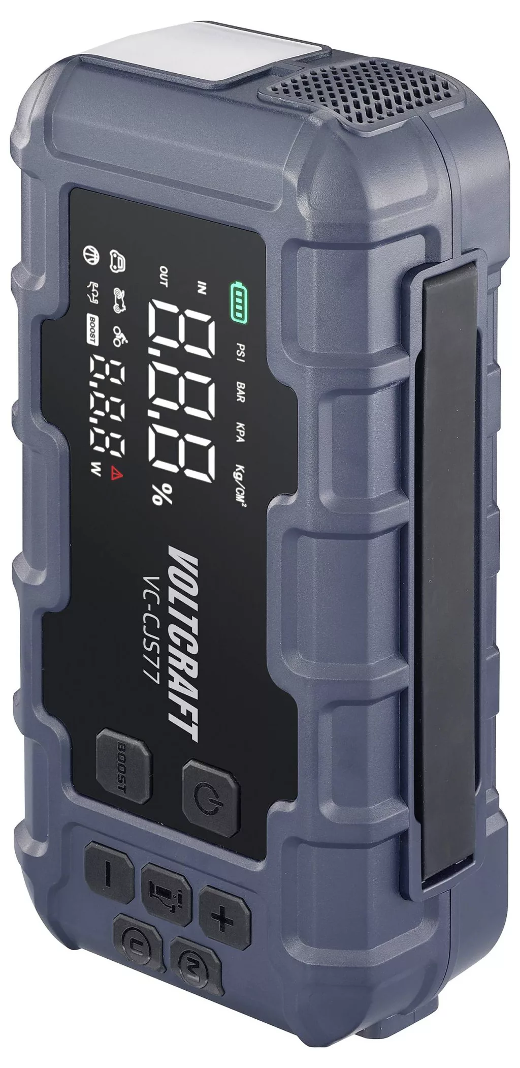 Mobil indítóberendezés kompresszorral és LED lámpávalHa a jármű akkumulátora lemerül, a Voltcraft 4 az 1-ben indítóberendezés bármikor, bárhol áramot biztosít a hálózaton kívüli indításhoz. A maximális indítási áram 1200 A 12 V-on, ideális legfeljebb 8 literes benzinmotorokhoz és legfeljebb 6 literes lökettérfogatú dízelmotorokhoz. Ezenkívül ez a 4 az 1-ben gyorsindító rendszer tartalmaz egy kompresszort (max. 11 bar), amely visszaállítja a defektes kerekek teljesítményét. A kijelző mutatja a nyomást (különböző mértékegységek között lehet váltani). Továbbá egy praktikus LED paneles munkalámpa is beépített, ami nemcsak éjszakai autólerobbanás esetén lehet rendkívül hasznos. A készülék 65 W-os USB-C® tápellátási porttal és SOS zseblámpa funkcióval is rendelkezik. A bikát a mellékelt USB-C® kábellel töltheti.