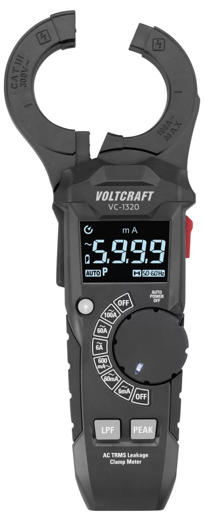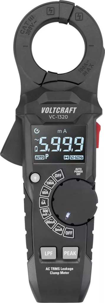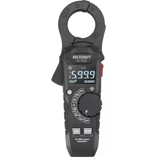 Pontosság és biztonság a szivárgási áram mérésébenA Voltcraft VC-1320 szivárgási áram lakatfogót a legkisebb szivárgási áramok precíz mérésére tervezték: Az 1 μA-től 6000 mA-ig terjedő ultramagas felbontásnak köszönhetően lehetővé teszi még a legkisebb hibák diagnosztizálását is, valamint 0 és 100 A közötti váltakozó áram mérését. Hat értéktartomány áll rendelkezésre: 6000 mA, 60,00 mA, 600,0 mA, 6000 A, 60,00 A, 100 A. A valódi effektív érték mérése mindig megbízható értékeket szolgáltat, még nem szinuszos jelalakkal is. Az EN61010 szabvány szerinti CAT III 300 V biztonsági kategória biztonságos használatot biztosít alacsony feszültségtartományban.