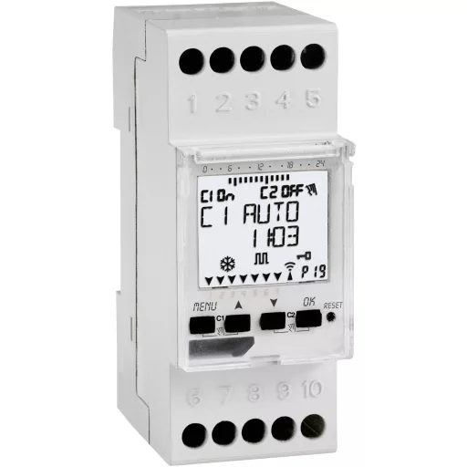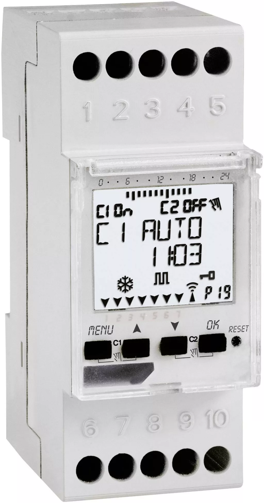 Műszaki adatok: Alkalmazás helye: Beltér · Időkapcsoló óra típus: Digitális · Kapcsolási ciklus: Heti program, Éves program · Kapcsolási teljesítmény (max.): 3500 W · Kapcsolóóra jellemzők: Véletlen kapcsolás funkció, Szabadságpromramm, Ciklikus program · Védelmi típus: IP20 · Üzemi feszültség: 230 V/AC
