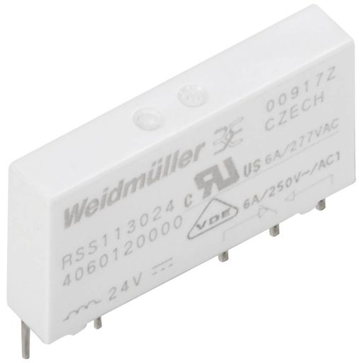 Műszaki adatok: Csatlakozó (építőelem): Dugaszolós csatlakozó · Ellenállás (tekercs): 3390 Ω · Gyártói szín: Fehér · Hanyatlási idő: 4 ms · Hőmérséklet (max.): +85 °C · Hőmérséklet (min.): -40 °C · Ipari termék: Igen · Kapcsolási feszültség (max.): 250 V/AC, 250 V/DC · Kapcsolási teljesítmény (max.): 1500 VA, 144 W · Kúszóút távolság: 5.5 mm · Max. kapcsolási áram: 6 A · Megszólalási feszültség (min.): 18 V/DC · Méret, magasság: 28 mm · Méret, mélység: 15 mm · Méret, szélesség: 5 mm · Névleges feszültség tekercs: 24 V/DC · Súly: 5.1 g · Védelmi típus: IP67 · Élettartam (mechanikus): 10 x 10