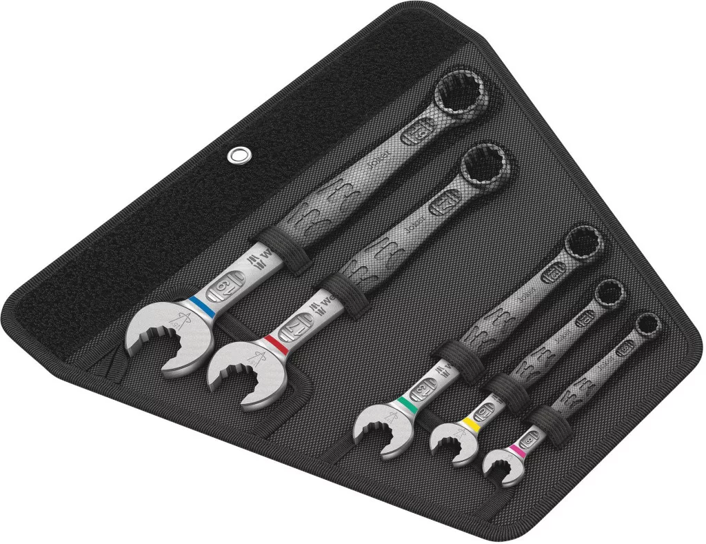 Mivel a csavarozáshoz szükséges telepítési hely szűkül, szükségesek olyan szerszámok, amelyekkel a felhasználó sikeresen dolgozhat még ilyen helyzetekben is. A szűk telepítési helyekhez további rögzítési pontokra van szükség a szerszámhoz. Tehát a villáskulcsok úgy módosíthatók, hogy az eszköz alkalmazási lehetőségei növekedjenek? A száj 7,5 ° -kal elforgatott kombinációja és a kettős hatszög geometria megduplázza a rögzítési pontokat. Ha a kulcsot a csavarozás során 180 ° -kal többször elforgatják a hossztengely körül, négy rögzítési lehetőség van, és az anyákat vagy a csavarfejeket 15 ° -onként „be lehet csomagolni”. A Joker 6003 intelligens állkapocs-geometriájával jelentősen kibővíti a felhasználók körét zárt térben. A Joker 6003 minden forduló után automatikusan megtalálja a megfelelő kiindulási pontot. A vékony, de robusztus gyűrűs oldal a szerszámtengelyhez képest 15 ° -kal van szögben. A kiváló minőségű felületbevonat magas és tartós korrózióvédelmet biztosít. A Take it easy szerszámkeresővel: színkódolás méret szerint. A hátsó tépőzáras rendszernek köszönhetően a Joker táskák falra, polcokra, műhelykocsihoz és a Wera 2go rendszerhez történő rögzítésre alkalmasak.