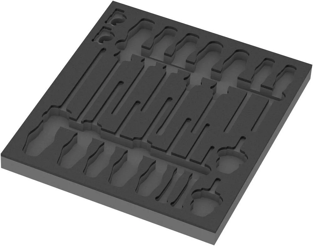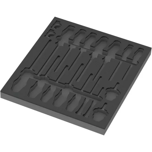 1 tartós hab tálca, szerszámok nélkül 2 szín a hiányzó alkatrészek gyors azonosításához Szélesség x magasság x mélység: 344 x 30 x 392 mm Csere habbetét Wera 9710-es cikkhez alkalmas a Tool Rebel műhelykocsihoz.