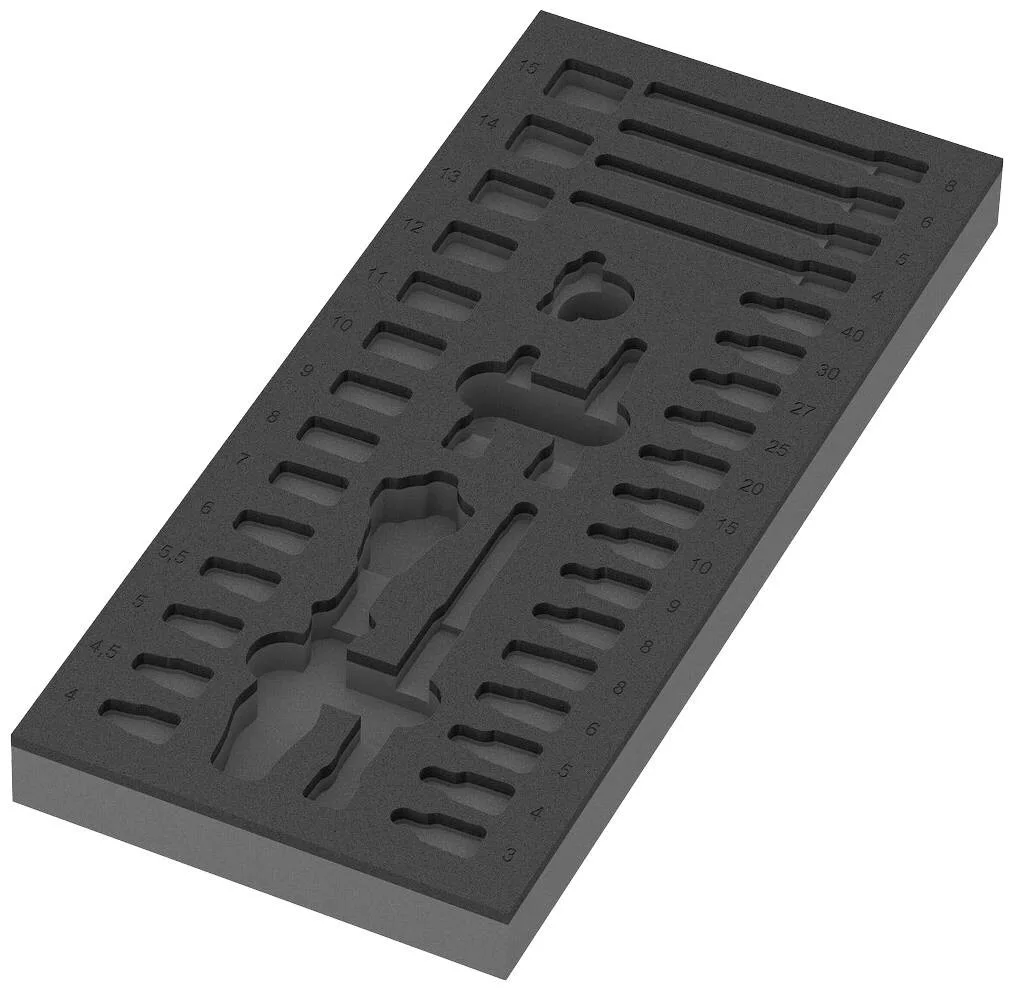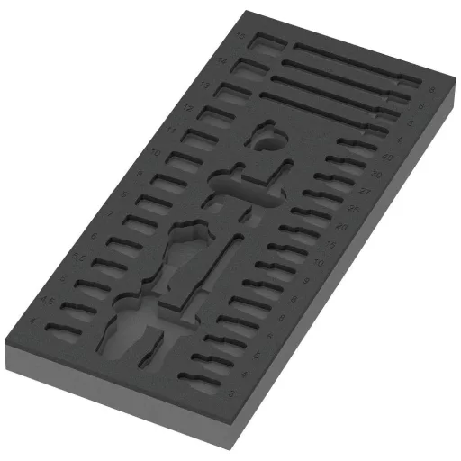 1 tartós hab tálca, szerszámok nélkül 2 szín a hiányzó alkatrészek gyors azonosításához Szélesség x magasság x mélység: 172 x 30 x 392 mm Csere habbetét Wera 9720-as cikkhez alkalmas a Tool Rebel műhelykocsihoz.