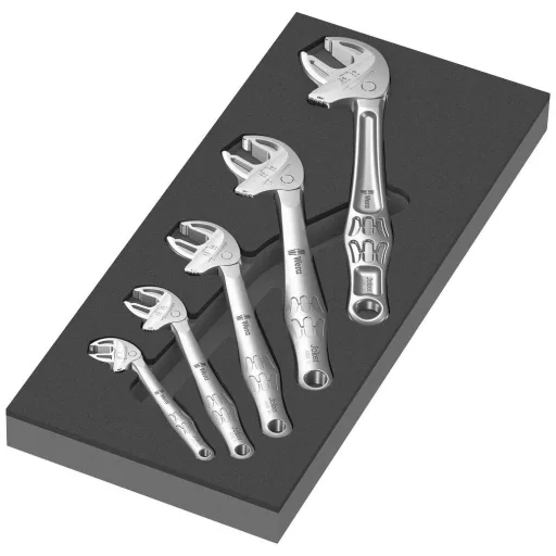 5 részes 6004 Joker önbeálló villáskulcs készlet, 2 tónusú habtálcában a Tool Rebel műhelykocsihoz. Szélesség x magasság x mélység: szerszám nélkül 172 x 30 x 392 mm, szerszámokkal 172 x 35 x 392 mm.