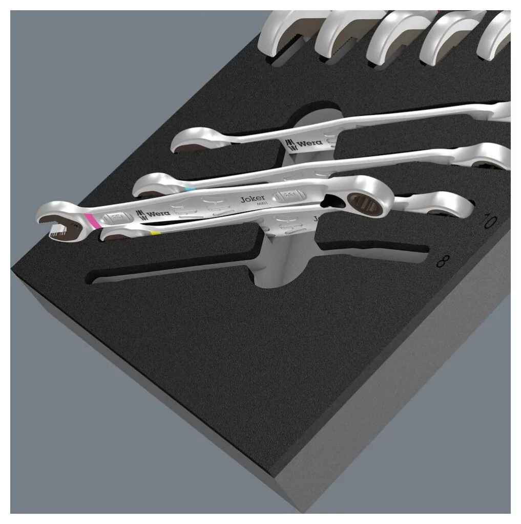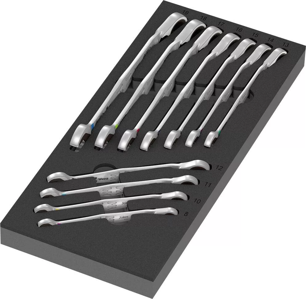 11 részes készlet kapcsolható racsnis kulcsokkal 6001 Joker Switch 2 színű habbetétben a Tool Rebel műhelykocsihoz. Szélesség x magasság x mélység: szerszám nélkül 172 x 30 x 392 mm, szerszámokkal 172 x 48 x 392 mm.