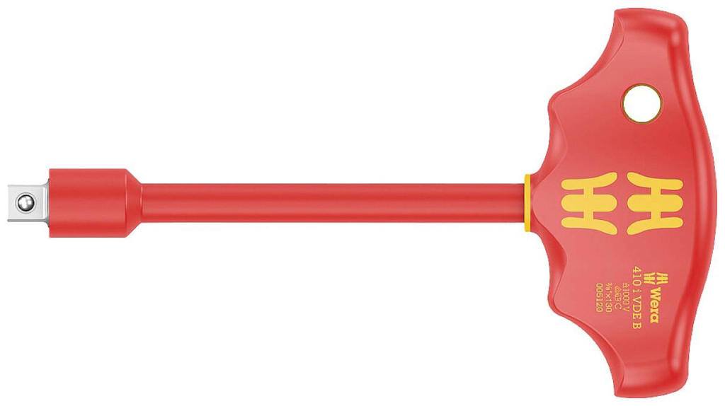 A T-fogantyú formája különösen nagy meghúzási és lazítási nyomatékok átvitelét teszi lehetővé. A markolat geometriája jól kitölti az egész kezet, az ujjak pedig szilárdan fekszenek a lágyan lekerekített süllyesztett markolatokban. Ez biztosítja az optimális, ergonomikus erőátvitelt. Egyedileg tesztelt szerszám az IEC 60900 szabványnak megfelelően 10 000 V-on a biztonságos munkavégzés érdekében 1000 V-os megengedett feszültség mellett. Csak 3/8" -os VDE bit foglalatokhoz és a Wera Zyklop VDE 8740, 8760, 87967, 87967 sorozatú aljzatokhoz engedélyezett. A bevonatos fogantyú az érzékeny felületeket is megvédi a sérülésektől.