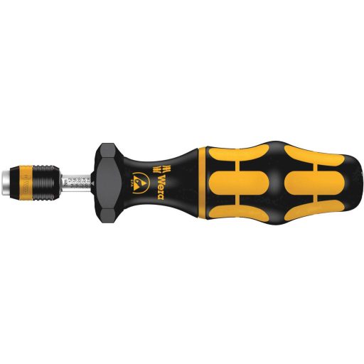 Wera csavarhúzó. Biztonságos védelem az elektrosztatikus energia és az ahhoz kapcsolódó károsodások ellen. Változtatható nagypontosságú nyomaték beállítás A szükséges nyomaték értéket külön szerszám nélkül egyszerűen be lehet állítani A skálaérték jó olvashatósága. Rapidaptor gyorscsere technológia a villámgyors bit cseréhez Korlátlan lazítási nyomaték berágódott csavarok oldására Többkomponensű Kraftform markolat kemény és lágy zónákkal a gyors munkához és a kéz felület kímélésére. Alkalmas 1/4 "-es hatszögletű hajtásokhoz a DIN ISO 1173-C 6.3 és az E 6.3 (ISO 1173) szerint.