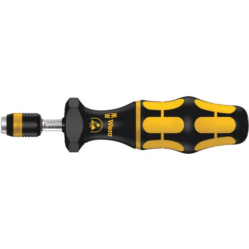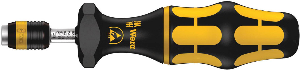 Wera csavarhúzó. Biztonságos védelem az elektrosztatikus energia és az ahhoz kapcsolódó károsodások ellen. Változtatható nagypontosságú nyomaték beállítás A szükséges nyomaték értéket külön szerszám nélkül egyszerűen be lehet állítani A skálaérték jó olvashatósága. Rapidaptor gyorscsere technológia a villámgyors bit cseréhez Korlátlan lazítási nyomaték berágódott csavarok oldására Többkomponensű Kraftform markolat kemény és lágy zónákkal a gyors munkához és a kéz felület kímélésére. Alkalmas 1/4 "-es hatszögletű hajtásokhoz a DIN ISO 1173-C 6.3 és az E 6.3 (ISO 1173) szerint.