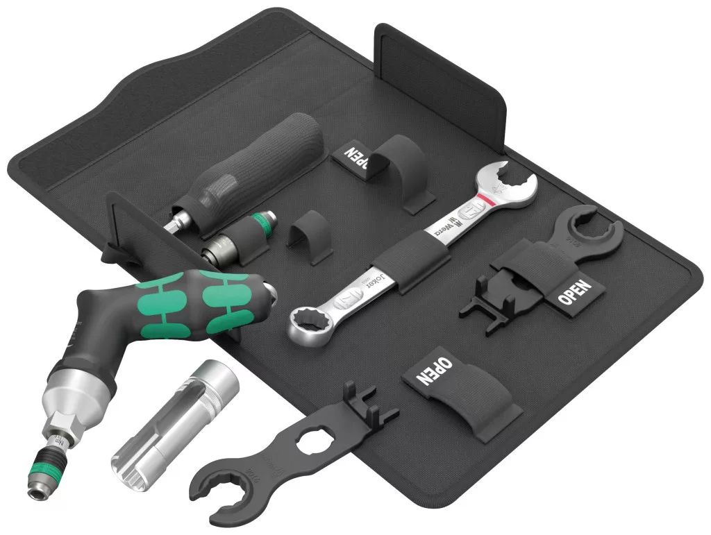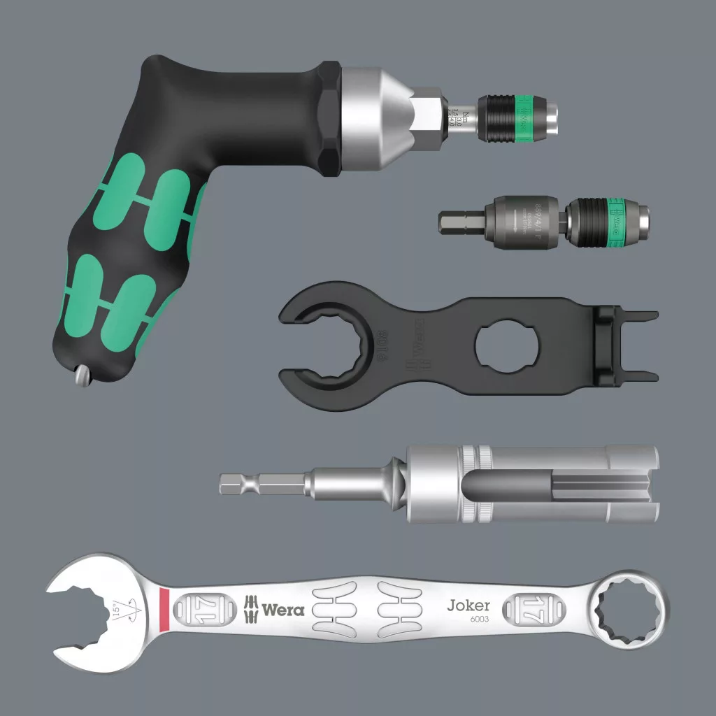 7 részes szerszámkészlet fotovoltaikus rendszerek összeszereléséhez. 1 db 7442-es nyomatékcsavarhúzó (pisztolymarkolat) a 3,0-6,0 Nm mérési tartományhoz. Numerikus nyomatékérték kijelzés. Megbízható csúszás és hangjelzés a beállított nyomaték elérésekor. 1 db Rapidaptor bittartó 889/4/1 F szabadonfutó funkcióval a különösen gyors visszamozgatás érdekében jobb oldali meghúzáskor, zavaró lerakás nélkül. 1 db 6003 Joker kombinált kulcs. A speciális pofageometria kibővíti a szerszám rögzítési lehetőségeit, így a kombinált villáskulcs különösen alkalmas szűk beépítési helyekre. 2 szerelőkulcs az MC4 (Multi-Contact) szolár csatlakozóhoz. 1 db 1/2" -os (hornyos) 17-es méretű dugókulcs-betét a beépített csatlakozók összeszereléséhez, 1 db szerszámszár (1/4" -től 1/2" -ig) a kézi működtetésű dugaszolókulcs-betétekhez.