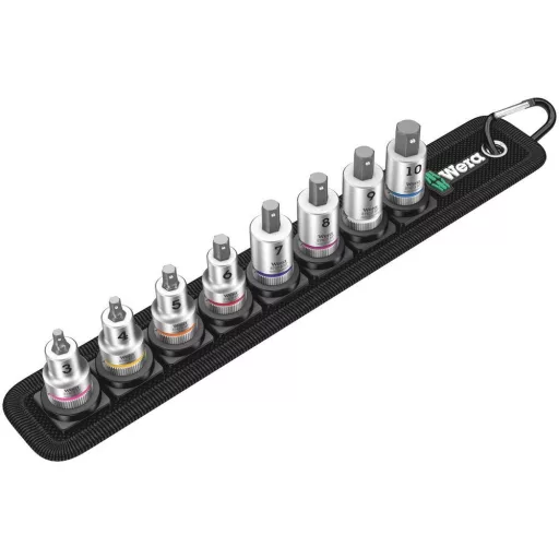 Robosztus textilöv (öv) a tipikus Wera kialakításban, 8 bit anyával a legkisebb helyek között. A sima fordítószerkezet biztosítja az anyák biztonságos rögzítését és könnyű eltávolítását. A "Könnyen" szerszámkeresővel színes méretkódolással - a kívánt eszköz egyszerű és gyors megtalálásához. Tartalékhoroggal rendelkezik az övhurkokhoz vagy -zsákokhoz történő rögzítéshez. Nagyon rövid, stabil bitcsavar, a Wera Bit technológia előnyeivel. Tartó funkcióval ellátott bitcsavarok a különösen kényelmes csavarozáshoz és csökkentik a csavarvesztés kockázatát a munkadarab adagolásakor. Nem szövött hátul és tépőzáras szalagok révén könnyen rögzíthető pl. Falra, polcra, műhelykocsira és a Wera 2go szerszámszállító rendszerre.