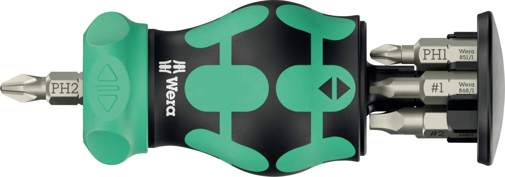 Különösen kicsi bittartó rendkívül rövid bittartóval a nehezen elérhető helyekhez. A nyélbe integrált finom fogazatú racsni gyors munkát biztosít. A csavarozási irány váltása intuitív: ha a gyűrűs kapcsolót jobbra forgatjuk, a csavar jobbra forog ha a gyűrűs kapcsolót balra forgatjuk, a csavar balra forog. Precíz munkavégzéshez a racsnis mechanizmus a 0 pozíció használatával kikapcsolható. 6 db univerzális használatra alkalmas, strapabíró bitet tartalmaz. A bittartóban található erős permanens mágnes biztosítja a bit biztonságos rögzítését. A kétkomponensű Kraftform nyél a kemény és puha zónák praktikus kombinációjával biztos fogást és precíz munkát tesz lehetővé.