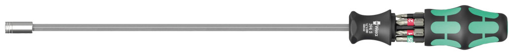 7 részes bitkészlet univerzális használatra. Bitkézi tartó 300 mm hosszú pengével és nagyon vékony, zárható bittartóval a nehezen elérhető helyek eléréséhez. A különösen vékony kialakításnak köszönhetően a csavarok nagyon szűk beépítési helyzetekben is működtethetők. Többkomponensű Kraftform markolat, a gyors munkavégzéshez és különösen ergonomikus csavarozáshoz A fogantyúba integrált tár a bitek tárolására. 6 szívós, 25 mm hosszú bit (Phillips és Pozidriv és TORX®). Ez a készlet egy 6 darabból álló csavarhúzó készletet helyettesít, és minimálisra csökkenti a szükséges felszerelést. Hatlapú gördülés védelemmel az elgurulás ellen.