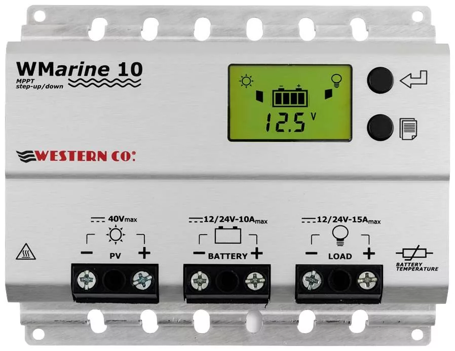 A WMarine10 töltésvezérlő egy buck-boost töltőáramkört valósít meg. A fő különbség ez a vezérlő és más típusok, mint például a WRM15 töltésvezérlő között (amely egy buck töltési áramkört valósít meg), hogy a WMarine10 lehetővé teszi, hogy a szolár panel magasabb és alacsonyabb feszültségen is működjön, mint az akkumulátoré, így lehetővé teszi a szolár használatát. A 10V-os nyitott feszültségű modul 12V-os és 24V-os akkumulátorok töltésére használható. A napelem feszültsége 5 V és 40 V között van a 12 V-os és a 24 V-os akkumulátorok esetében is az MPPT áramkör működtetésekor. A WMarine10 a teljes megoldás szigeti napelemes rendszerek megvalósítására, közlekedési lámpák és világítási rendszerek táplálására, kisfeszültségű eszközökre, valamint lakóautók és vízi járművek akkumulátorainak töltésére. A rendelkezésre álló különféle töltőprogramok a WMarine10-et teljes körű megoldássá teszik számos alkalmazáshoz például olyan kamerák áramellátására, amelyeknek csak nappal kellene működniük, vagy olyan világítótesteket vagy közlekedési lámpákat, amelyeknek csak éjszaka kellene működniük, vagy olyan világítási rendszereket, amelyeknek bizonyos számú órát kell működniük. A WMarine10 a napelem feszültségétől függően érzékeli a nappali/éjszakai üzemmódot, így nincs szükség további érzékelőkre a vezérlőhöz. A tágas kijelző egyszerű és intuitív ikonokon keresztül mutatja a vezérlő működési állapotát, valamint megjeleníti a töltőáram, az akkumulátor feszültség, a napelem modul által termelt energia és a töltési folyamat során felhasznált energia értékeit.