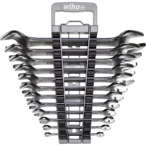 A szorosan meghúzott csavarok kinyitása hatalmas erőfeszítést igényel. A Wiha kettős nyitott kulccsal a felhasználó az emelőhatásnak köszönhetően bármilyen csavaros csatlakozást könnyen kinyithat. 15 ° -os állkapocsállással a dupla nyitott kulcsok tökéletesek szűk helyeken történő munkavégzéshez. Ideálisak csavarok és anyák ellensúlyozására is. Kiváló minőségű króm-vanádium acélból készült, dupla nyitott végű csavarkulcsok tartósságot és robusztusságot képviselnek, nem utolsósorban korrózióálló és könnyen tisztítható felületüknek köszönhetően. A készlet tartalmazza a 12 legnépszerűbb méretet, 6 és 32 mm között, szépen praktikus tartóba rakva. A tartó egyetlen kézzel kinyitható, hogy kivegye a megfelelő méretet, és a csúszásgátló felület erős tartást biztosít olajos vagy nedves munkakörülmények között is.