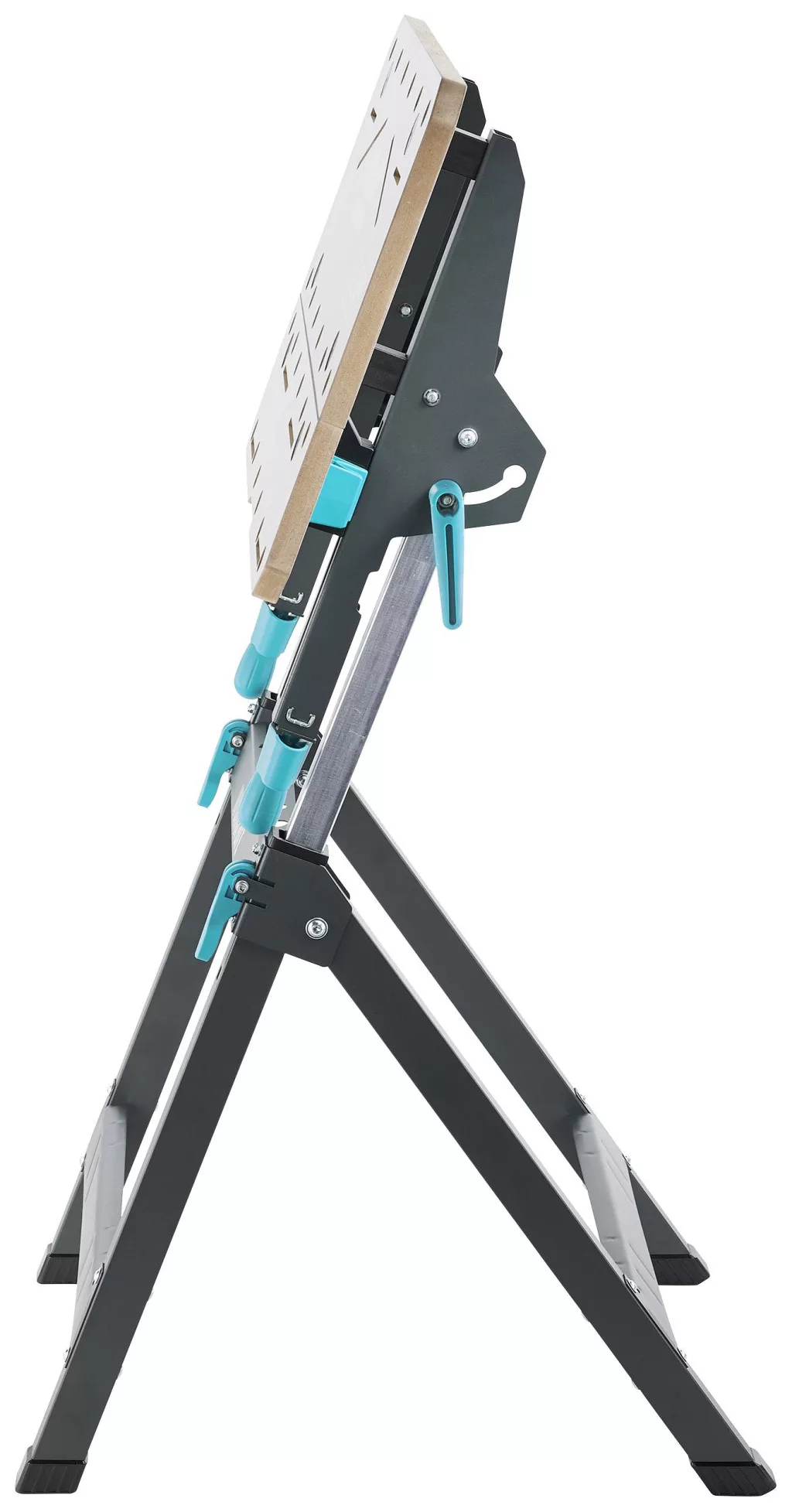 A MASTER 750 ERGO munkaasztalként is kiváló munkavégzési kényelmet és rugalmasságot biztosít. A bevonatos és FSC-tanúsítvánnyal rendelkező, ferde élű MDF-ből készült állítható asztallapok 680 x 390-520 mm változó méretű munkafelületet kínálnak. Ezenkívül az asztallap folyamatosan 60°-ig elforgatható, így munkaasztalként is használható. A kiváló minőségű csőacélból készült stabil alváz gyorsan összecsukható rendszerrel rendelkezik a rugalmas szállítás és a helytakarékos tárolás érdekében. A lábak alatti csúszásmentes gumi ütközőknek köszönhetően az asztalt összecsukott állapotban biztonságosan a falnak támaszthatja.