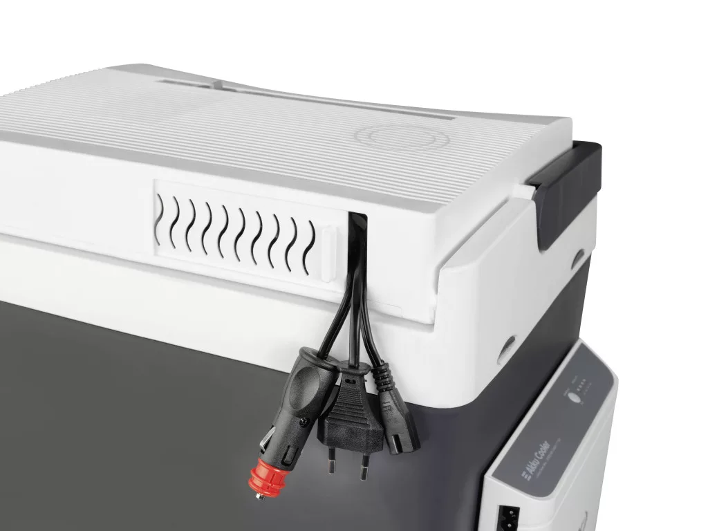 Nagy csúsztatható kábelrekesz szilárdan csatlakoztatott csatlakozókábellel 230 V / 12 V-hoz és akkumulátorhoz